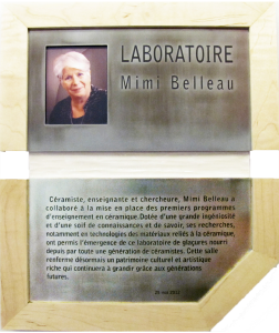 Céramiste, enseignante et chercheure, Mimi Belleau a collaboré à la mise en place des premiers programmes d’enseignement en céramique.  Dotée d’une grande ingéniosité et d’une soif de connaissance et de savoir, ses recherches, notamment en technologies des matériaux reliés à la céramique, ont permis l’émergence de ce laboratoire de glaçure nourri depuis par toute une génération d’artistes.  Cette salle renferme désormais un patrimoine culturel et artistique riche qui continuera de grandir grâce aux générations futures.